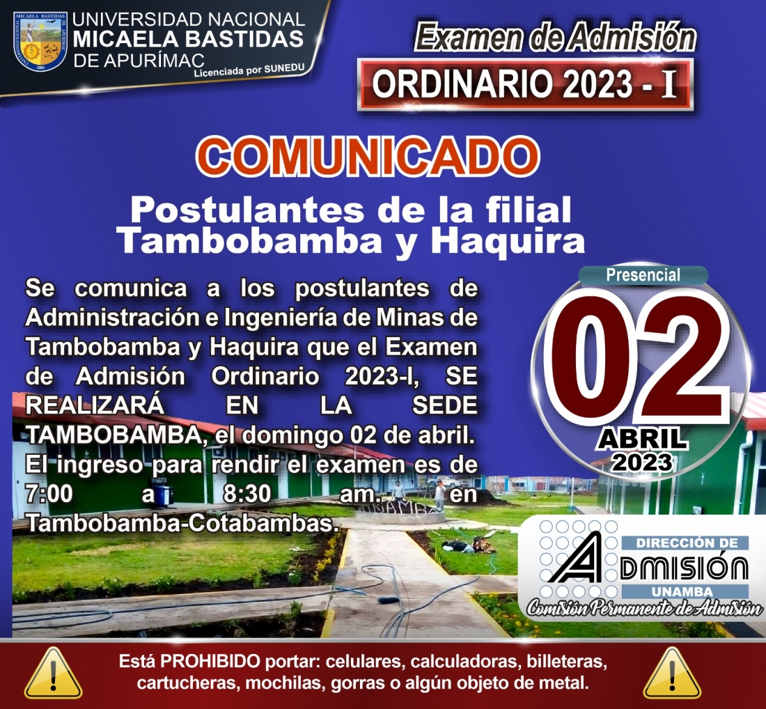 Se comunica a los postulantes de Administración e Ingeniería de Minas de Tambobamba y Haquira que el Examen de Admisión Ordinario 2023-I, SE REALIZARÁ EN LA SEDE TAMBOBAMBA, el domingo 02 de abril.