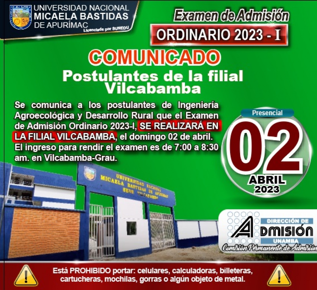 Se comunica a los postulantes de Ingeniería Agroecológica y Desarrollo Rural que el Examen de Admisión Ordinario 2023-I, SE REALIZARÁ EN LA SEDE VILCABAMBA-GRAU, el domingo 02 de abril.