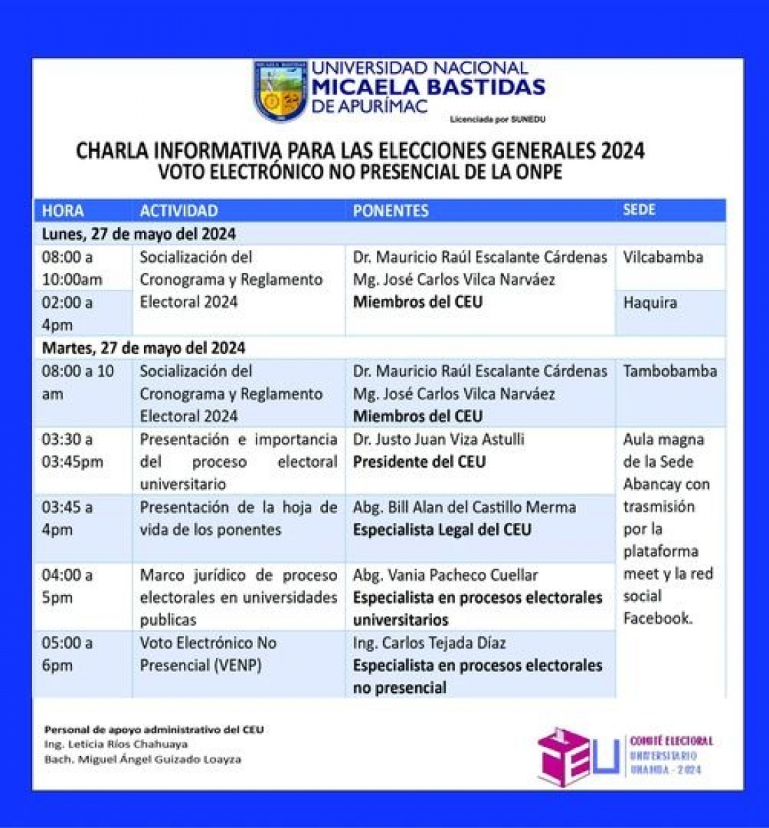 Comité Electoral de la UNAMBA convoca a Charla Informativa para las Elecciones Generales Universitarias 2024 – Voto Electrónico No Presencial de la ONPE