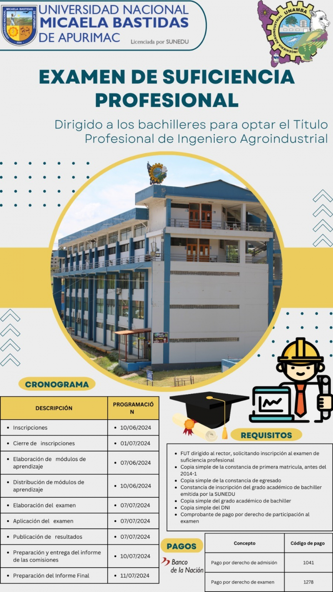 Convocatoria a Examen de Suficiencia profesional para optar el título profesional de Ingeniero Agroindustrial, según cronograma de inscripción.