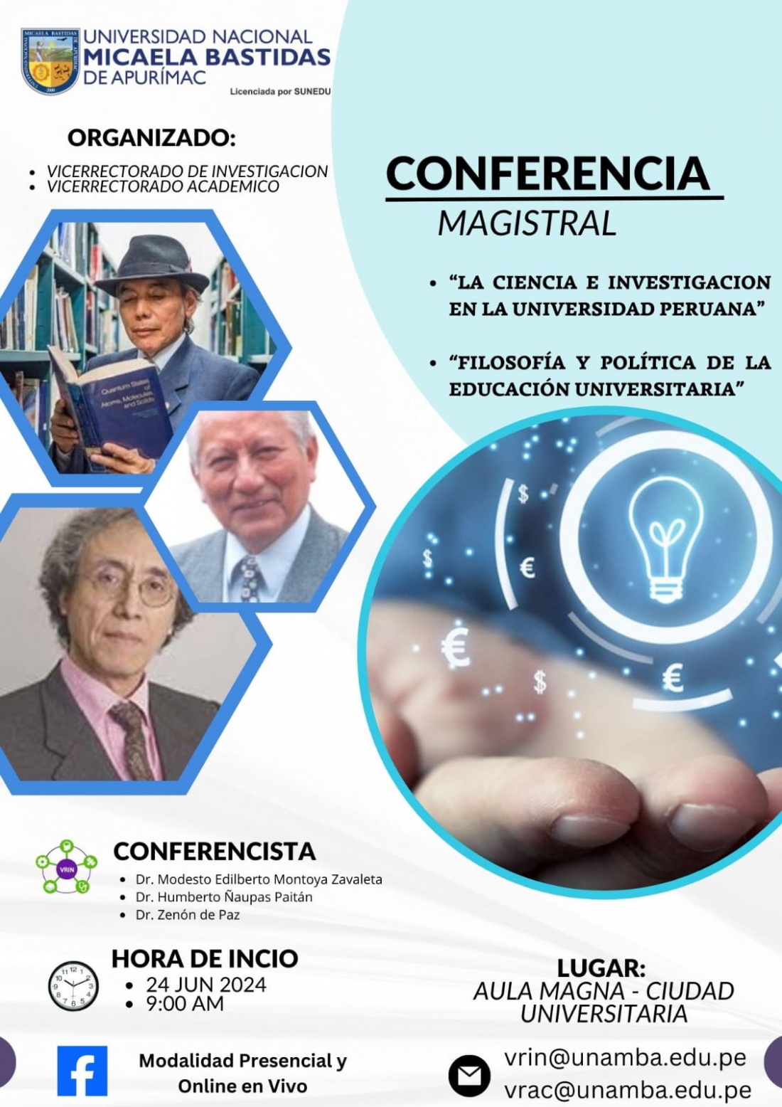 Te invitamos a la conferencia magistral "La ciencia e investigación en la universidad peruana" y "Filosofía y política de la educación universitaria".