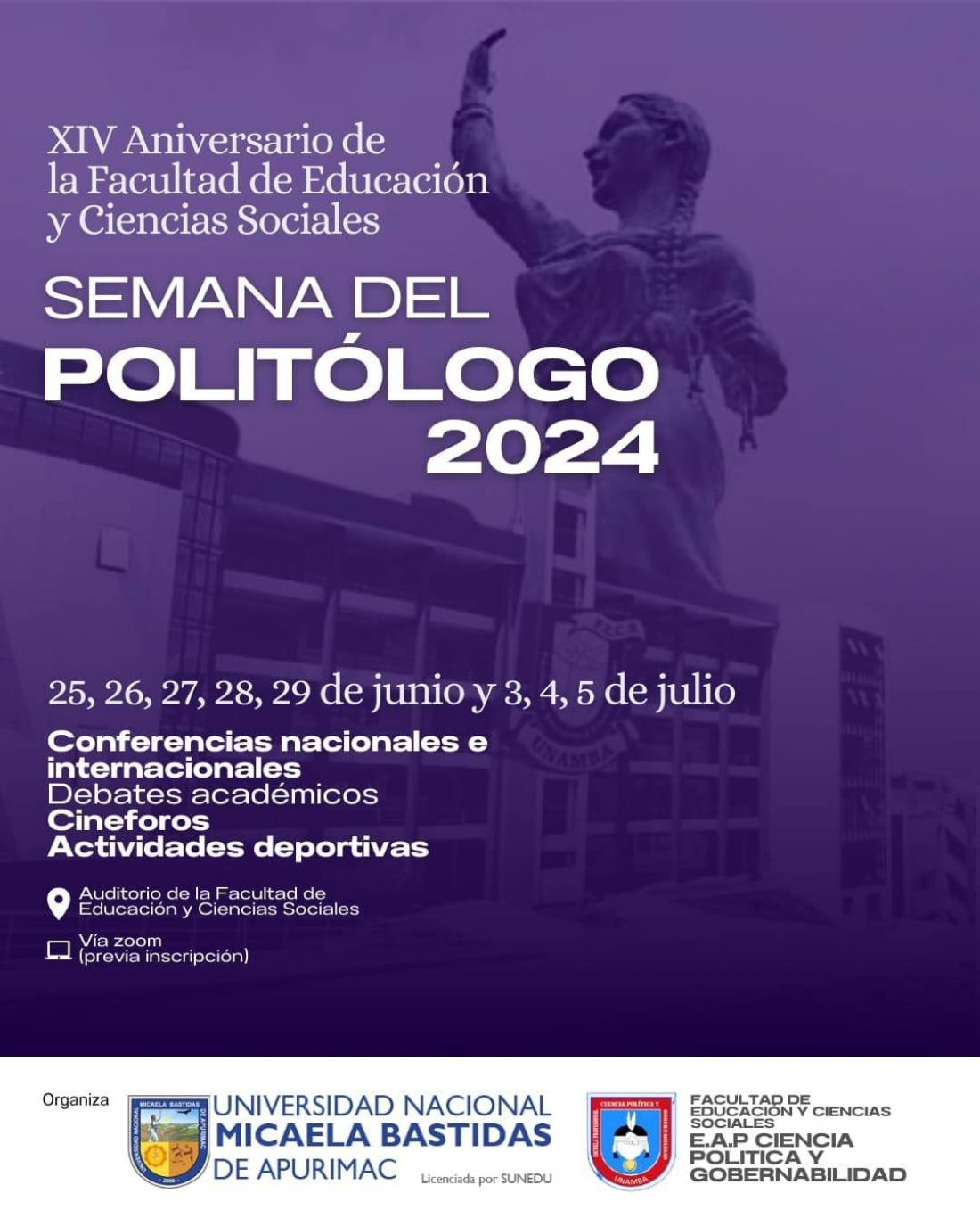 La Escuela Profesional de Ciencia Política y Gobernabilidad de la UNAMBA, les invita a las diferentes actividades académicas, culturales y deportivas por la Semana del Politólogo y con ocasión de celebrar el XIV aniversario La Facultad de Educación y Ciencias Sociales.