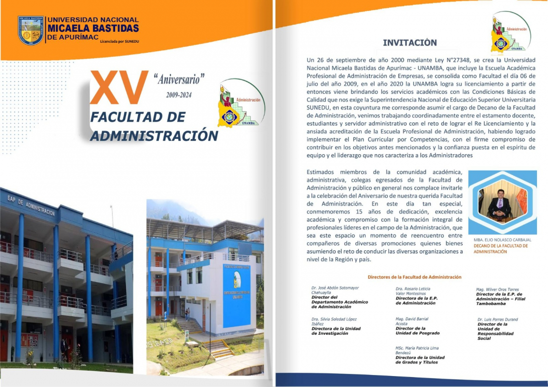 La Facultad de Administración de la UNAMBA invita a la comunidad universitaria y población en general, a los actos celebratorios por el XV aniversario de creación