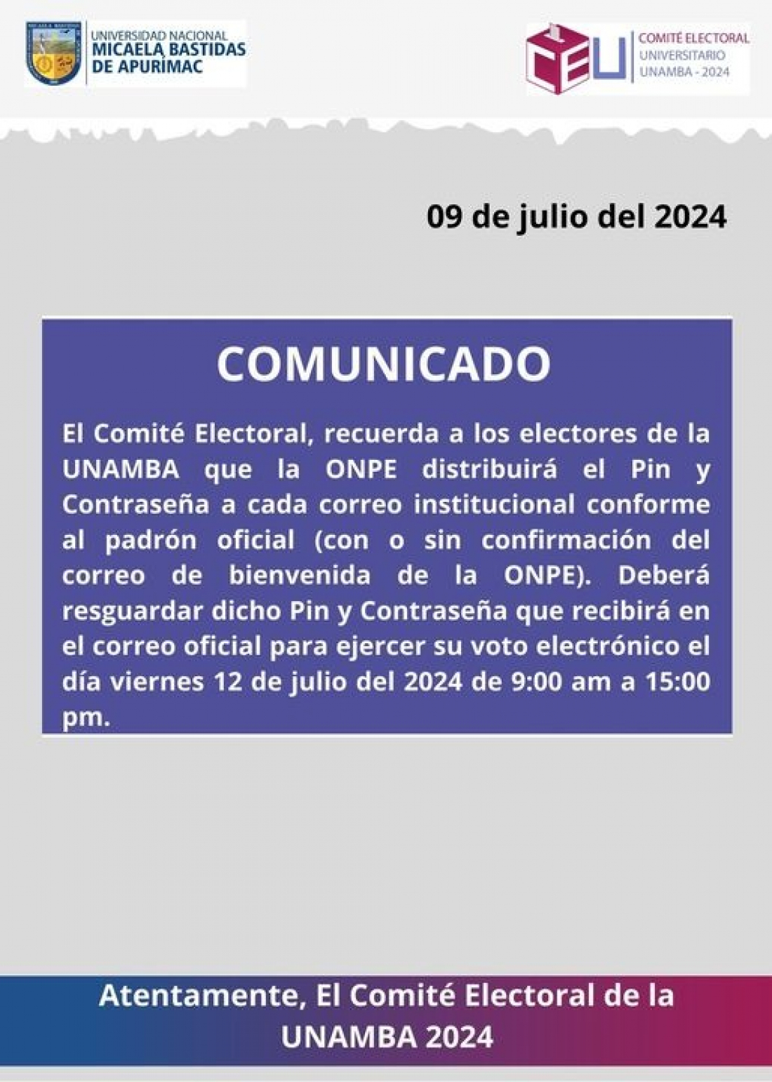 Comité Electoral - PIN y CONTRASEÑA - Elecciones Generales Universitarias UNAMBA 2024