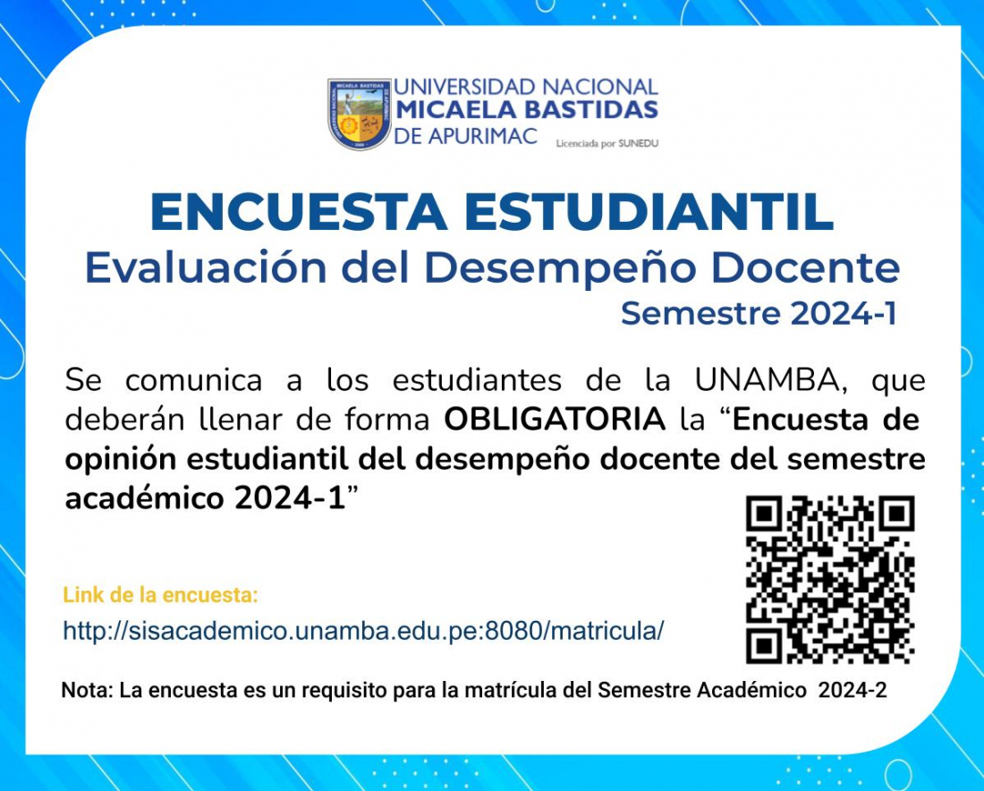 Se comunica a toda la comunidad estudiatil a particiapr en la ENCUESTA ESTUDIANTIL de Evaluación Desempeño Docente 2024-1 de la UNAMBA