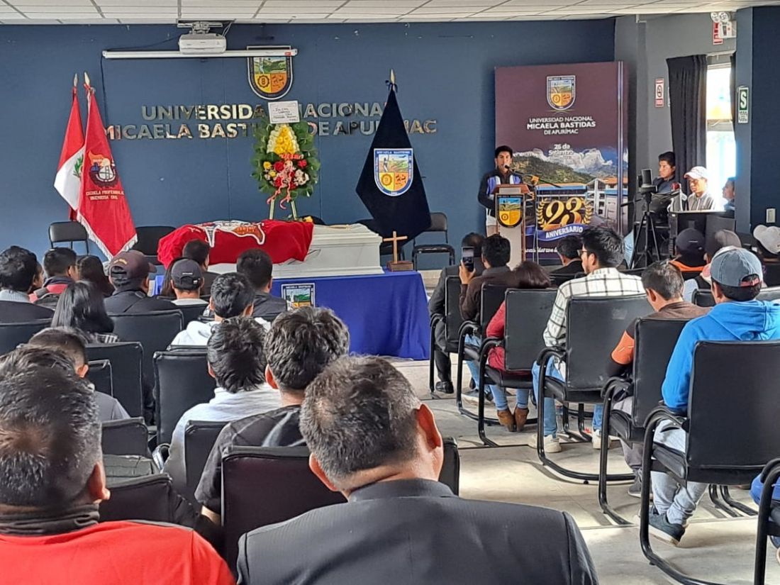 La Universidad Nacional Micaela Bastidas de Apurímac (UNAMBA), a través de las autoridades universitarias, docentes y estudiantes de la escuela profesional de Ingeniería Civil, rindieron homenaje póstumo al estudiante Jhon Mendoza Bolívar, quien fuera cruelmente asesinado en el sector de los túneles de Ccarcatera, hecho que está en investigación por las autoridades pertinentes.