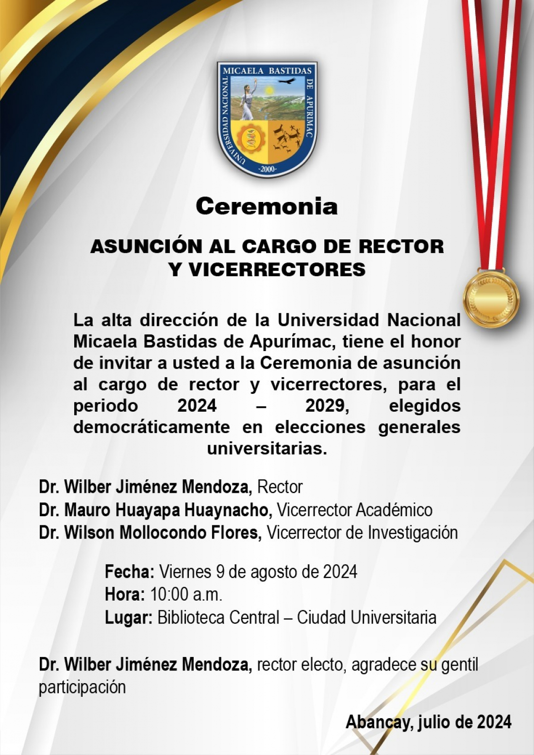 La UNAMBA tiene el honor de invitar a toda la comunidad académica, autoridades nacionales, regionales, locales y comunidad universitaria a la Ceremonia de Asunción de Cargo de Autoridades.