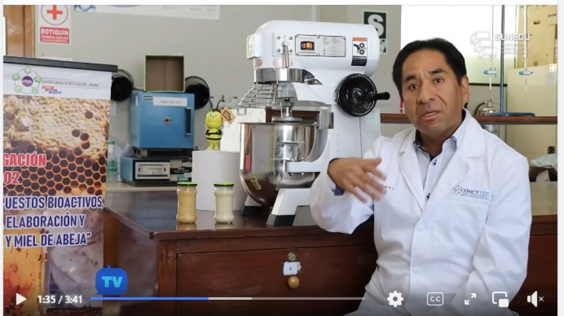 El Msc. Víctor Hugo Sarmiento Casavilca, docente investigador de la escuela profesional de Ingeniería Agroindustrial de la Universidad Nacional Micaela Bastidas de Apurímac (UNAMBA), presenta los resultados del proyecto de investigación “Estabilidad de compuestos bioactivos sensoriales y pro salud en la elaboración y almacenamiento de miel crema y miel de abeja”.