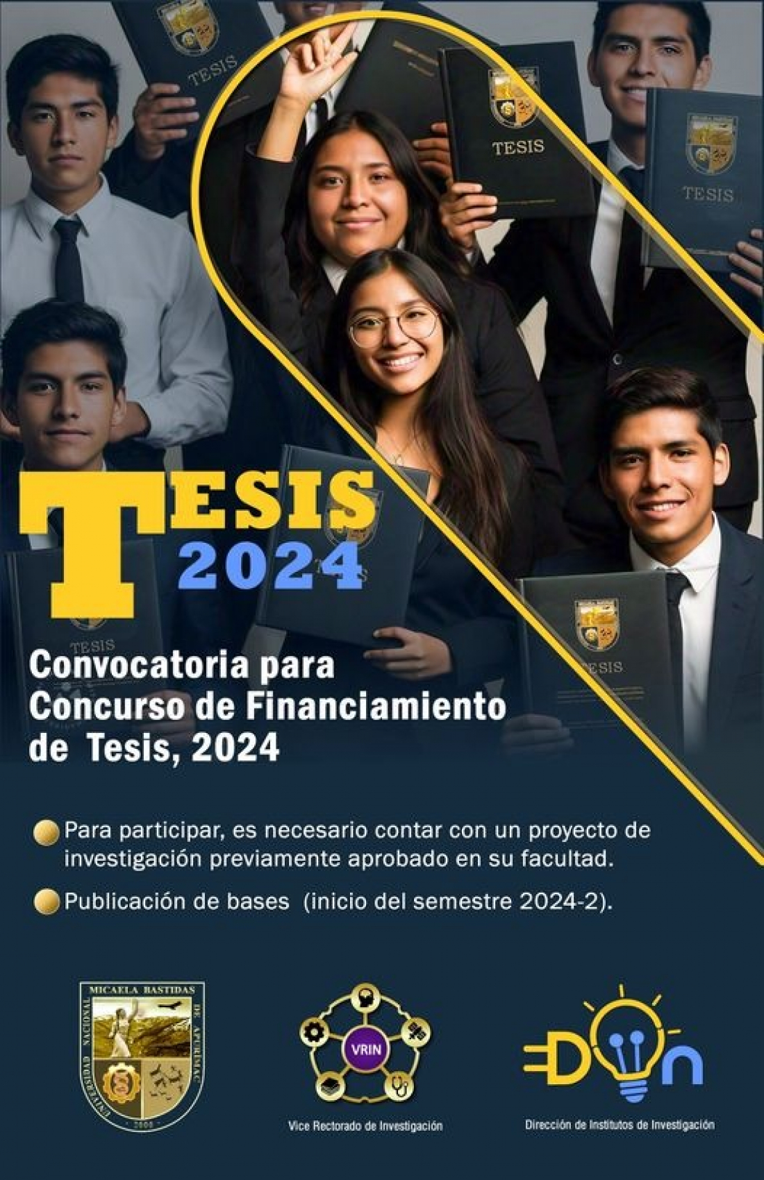 El Vicerrectorado de Investigación y la Dirección de Institutos de Investigación, convoca a los estudiantes y egresados de la UNAMBA a presentar la aprobación de su proyecto de investigación a través de una resolución de sus respectivas facultades (Requisito fundamental), para participar en el "Concurso de Financiamiento de Tesis 2024", cuyas actividades iniciarán en el semestre 2024-2.