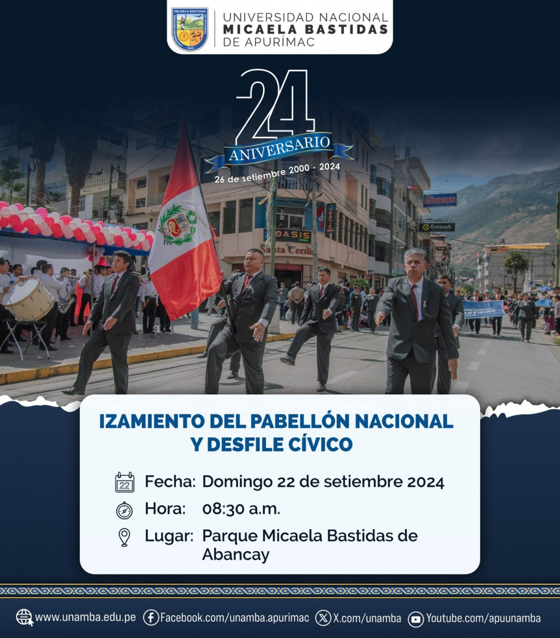 #24añosUNAMBA Izamiento del Pabellón Nacional y desfile cívico como parte de las celebraciones del 24° aniversario de la Universidad Nacional Micaela Bastidas de Apurímac.