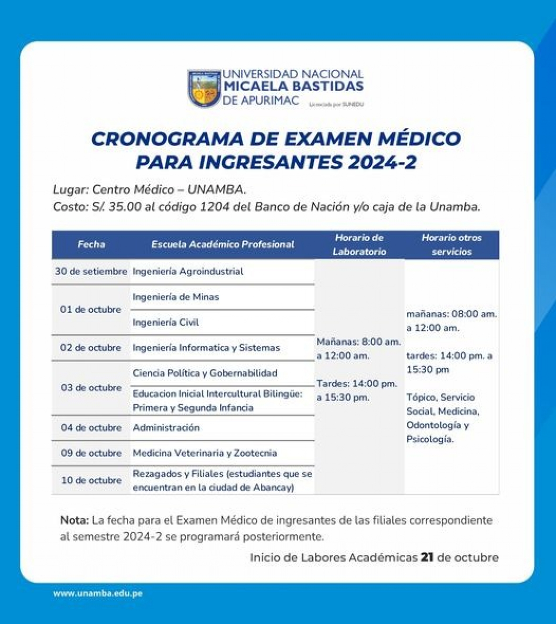Atencvión a todos los ingresnates 2024.-2 a la UNAMBA, se comunica el Cronograma de Examen Médico para ingresantes 2024-2