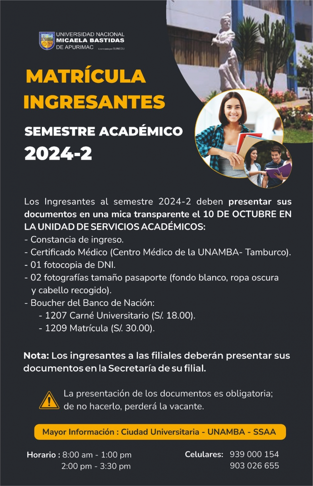 Los Ingresantes al semestre 2024-2 deben presentar sus documentos en una mica transparente el 10 DE OCTUBRE EN LA UNIDAD DE SERVICIOS ACADÉMICOS:
