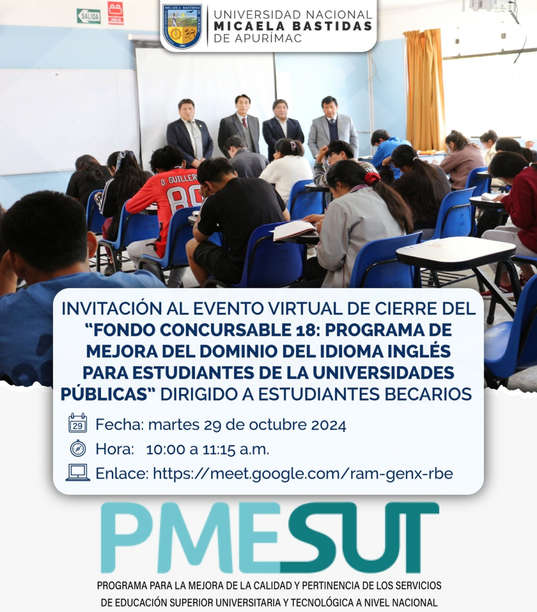 Se invita al evento virtual de cierre del “FONDO CONCURSABLE 18: PROGRAMA DE MEJORA DEL DOMINIO DEL IDIOMA INGLÉS PARA ESTUDIANTES DE LA UNIVERSIDADES PÚBLICAS”. Está beca está dirigida a estudiantes becarios de nuestra casa superior: