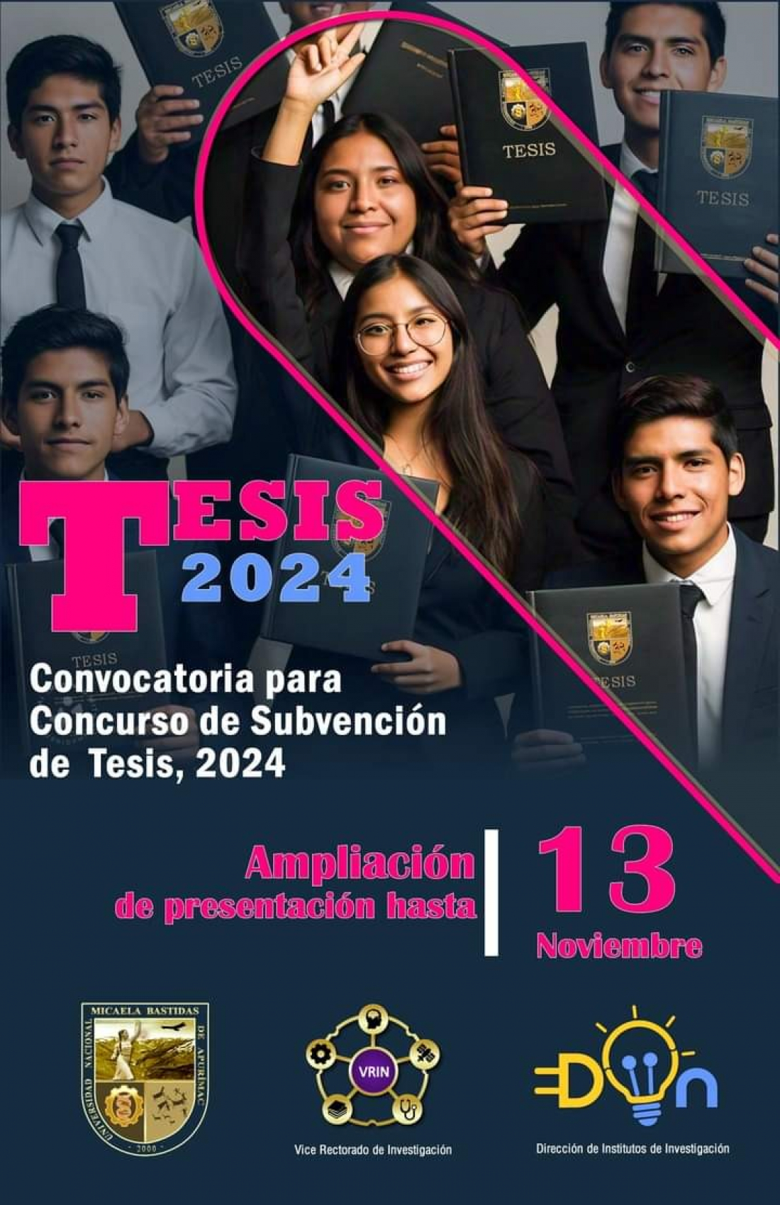 La UNAMBA, a través del Vicerrectorado de Investigación y la Dirección de Institutos de Investigación, convoca a los estudiantes y egresados de la UNAMBA a presentar sus proyectos de tesis hasta el 13 de noviembre 2024, montos a financiar hasta S/ 7 000 soles.