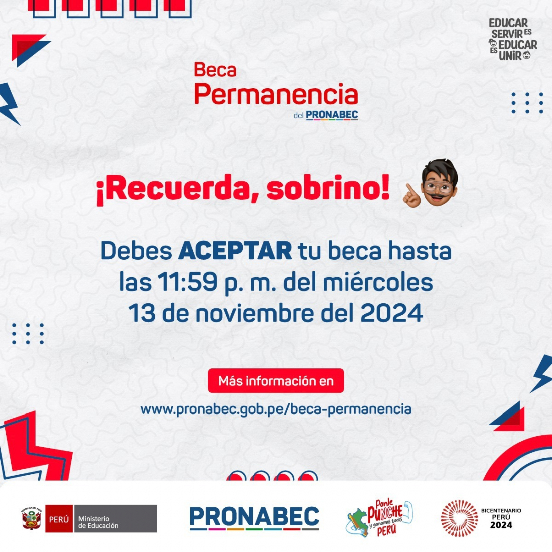 Si eres uno de los seleccionados de #BecaPermanencia 2024, debes ACEPTAR tu beca hasta el 13 de noviembre del 2024 . Si no la aceptas, perderás tu condición de seleccionado.
