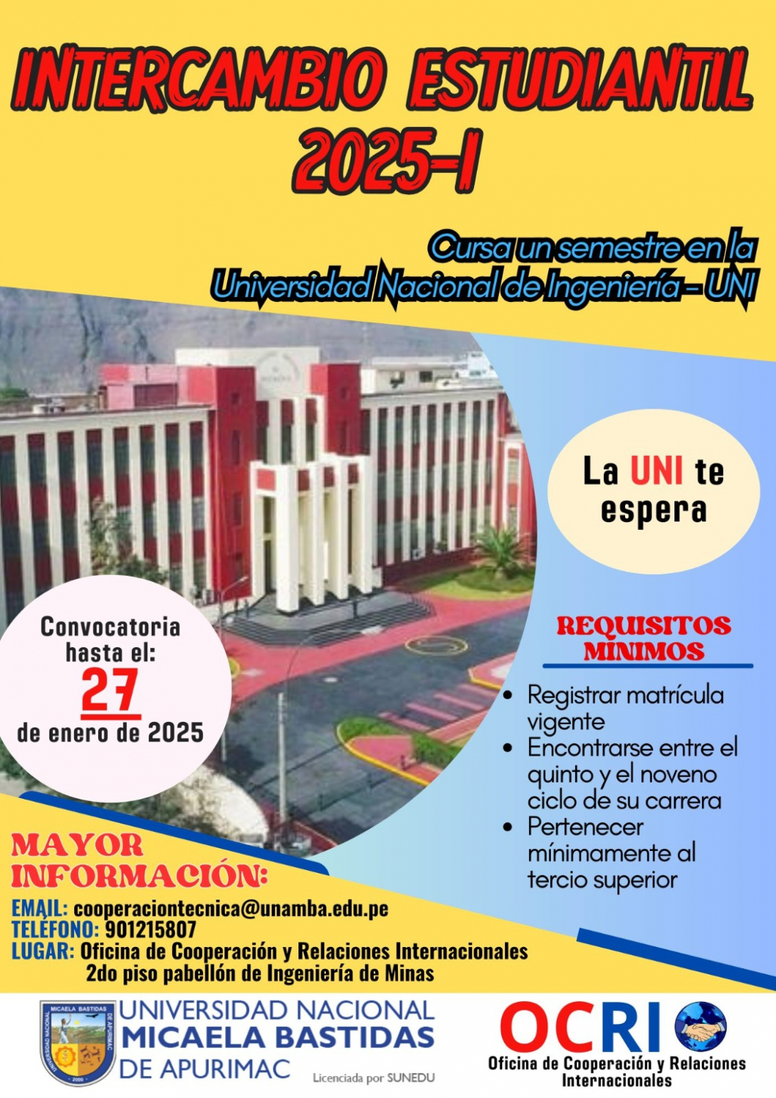 Intercambio estudiantil 2025 – I, curso de semestre en la Universidad Nacional de Ingeniería – UNI, convocatoria hasta el 27 de enero de 2025.