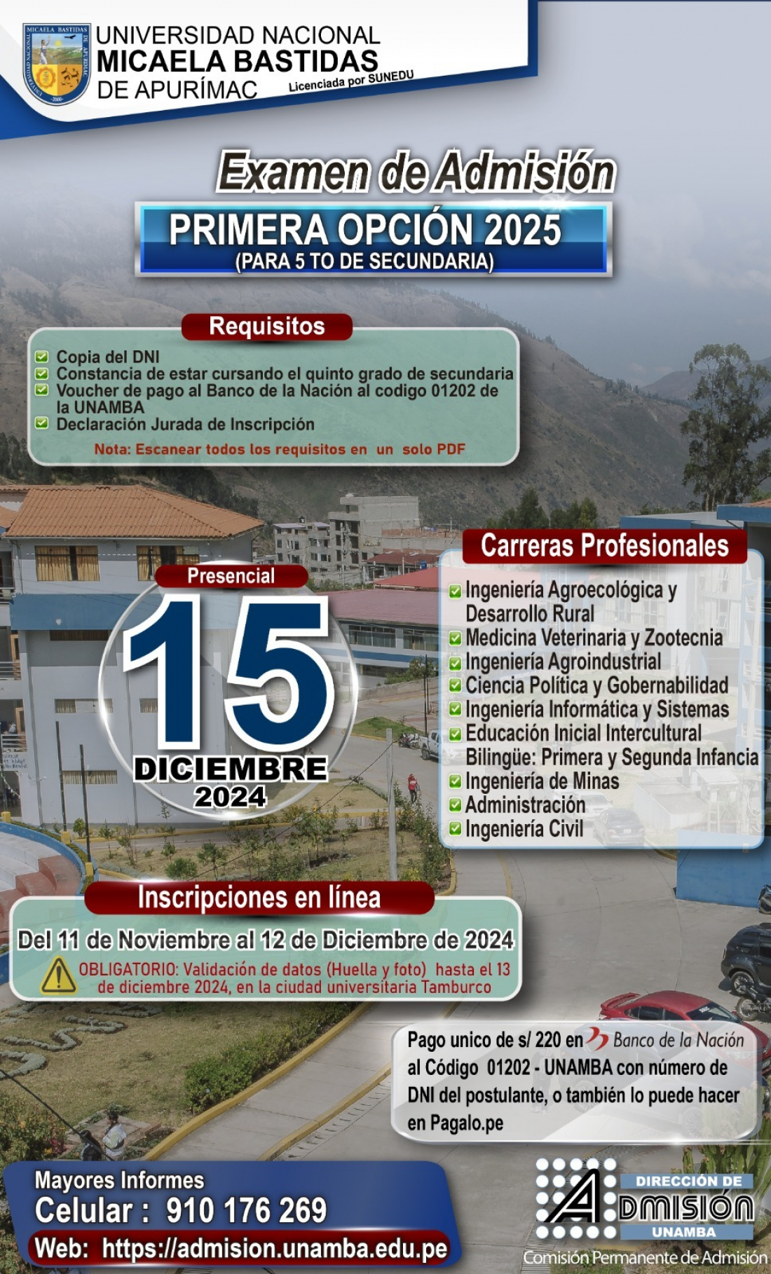 Convoca a Examen de Admisión Primera Opción 2024 para estudiantes de 5to de secundaria