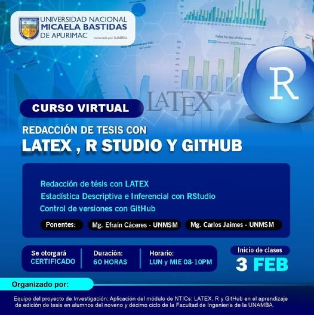 Organizado por: Equipo del proyecto de Investigación Aplicación del módulo de NTICs: LATEX. R y GitHub en el aprendizaje de edición de tesis en alumnos del noveno y décimo ciclo de la Facultad de Ingeniería de la UNAMBA.