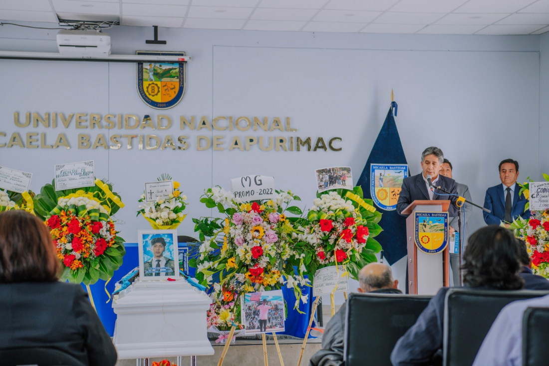 Las autoridades universitarias y docentes de la UNAMBA brindan su apoyo a familiares del estudiante Albiere Rosell Limascca Limascca en su último adiós.