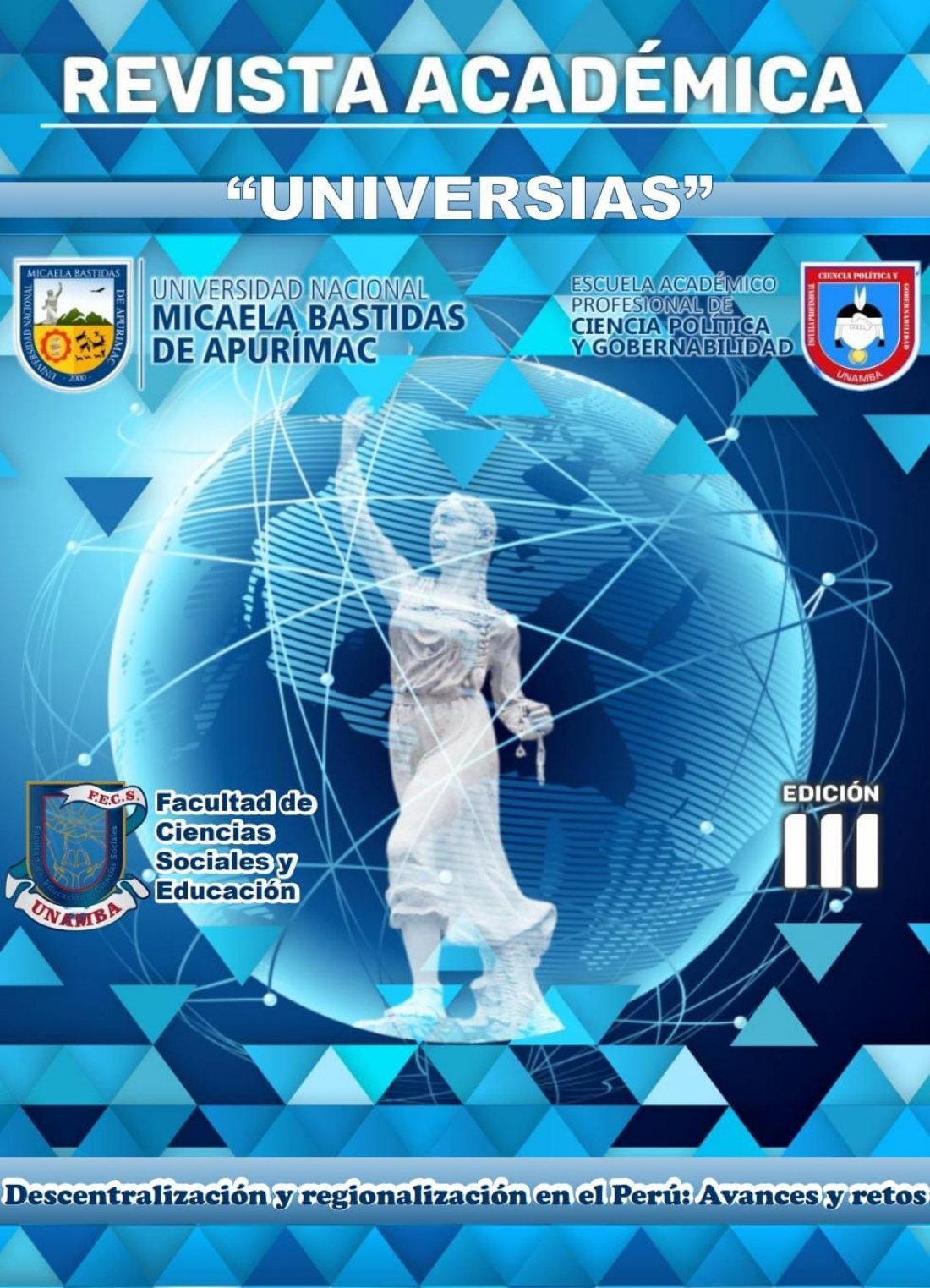 La Facultad de Educación y Ciencias Sociales de la UNAMBA, bajo la dirección del equipo editorial (estudiantes del 6to semestre de la EAP Ciencia Política y Gobernabilidad) presentan la tercera edición de la Revista UNIVERSIAS, una publicación académica que aborda con profundidad los desafíos y avances de la descentralización y regionalización en el Perú.