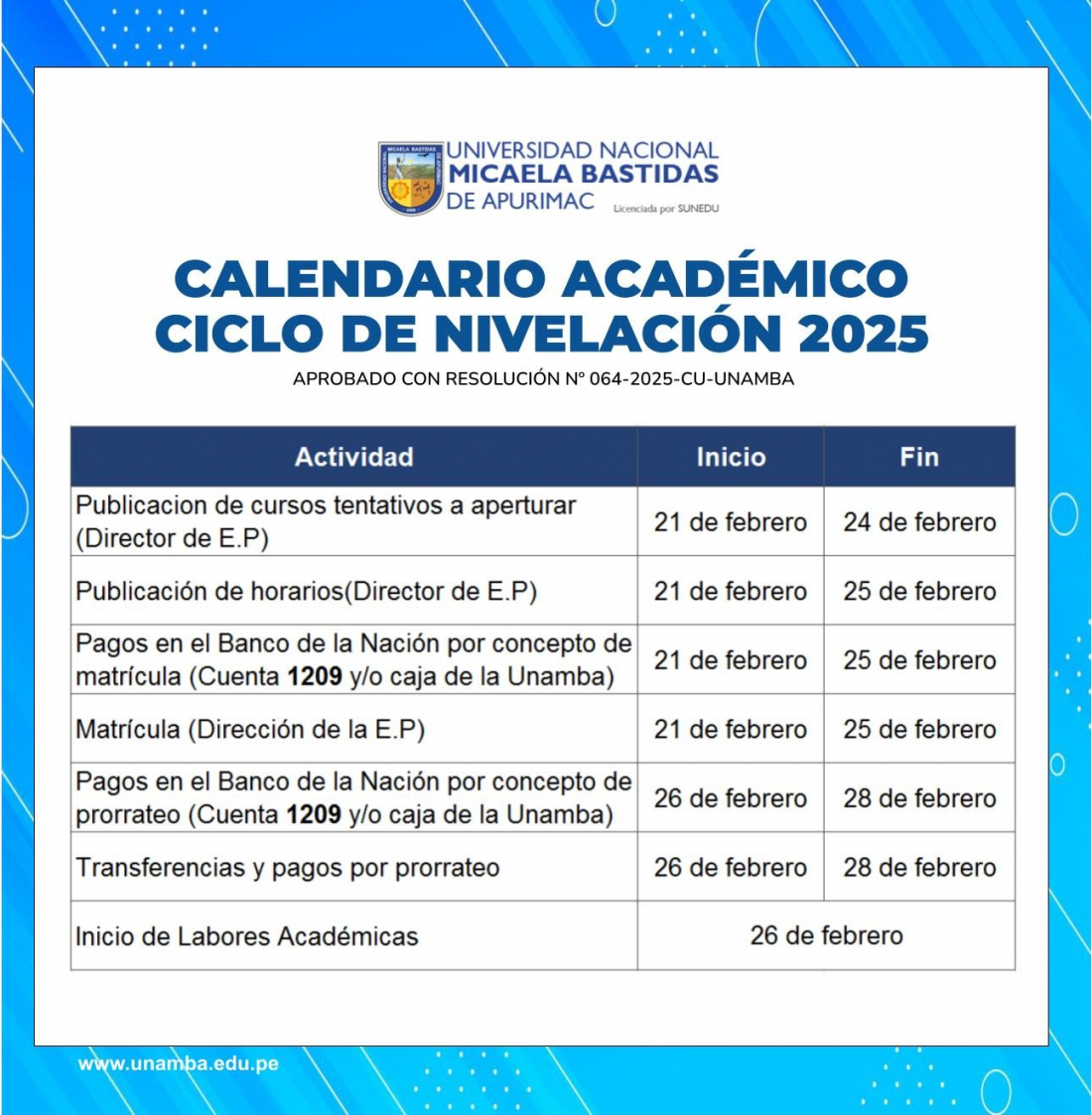 Proceso de matrículas de nivelación 2025 para estudiantes de todas las escuelasprofesionales de la UNAMBA.