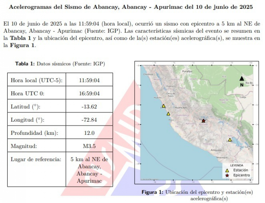 Abancay, Apurímac – 10 de junio de 2025, a las 11:59:04 hora local, se registró un sismo de magnitud 3.5 en Abancay, Apurímac. El epicentro del evento sísmico se localizó a 5 km al noreste de la ciudad, con una profundidad de 12 km, según el informe emitido por el Centro Peruano Japonés de Investigaciones Sísmicas y Mitigación de Desastres (CISMID) de la Universidad Nacional de Ingeniería (UNI).