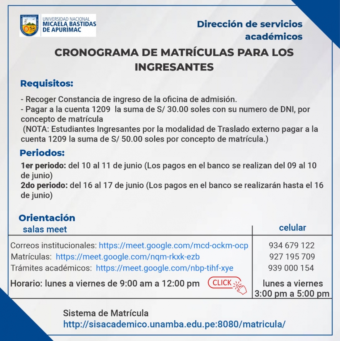 Sistema de matrícula: http://sisacademico.unamba.edu.pe:8080/matricula/