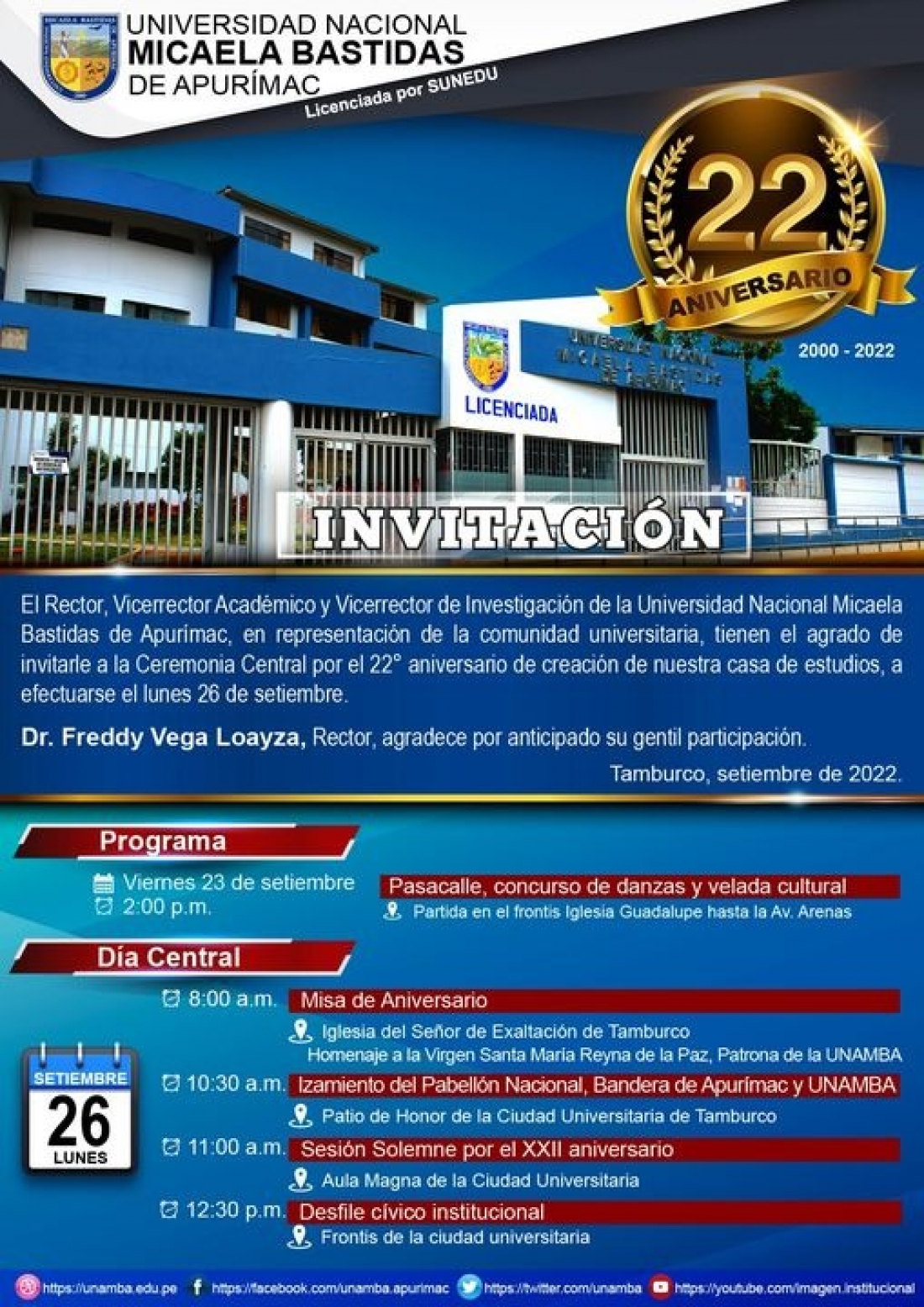 El Rector, Vicerrector Académico y Vicerrector de Investigación de la Universidad Nacional Micaela Bastidas de Apurímac, en representación de la comunidad universitaria, tienen el agrado de invitarle a la Ceremonia Central por el 22° aniversario de creación de nuestra casa de estudios, a efectuarse el lunes 26 de setiembre.
